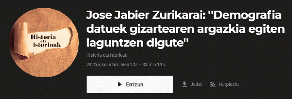 Demografia, munduko populazioaren hazkundea eta honen ondorioak Jose Jabier Zurikarai EUSTAT erakundeko soziologoaren laguntzaz aztertu ditugu Historia eta Istorioak podcastaren atal honetan. Munduko populazioa abiada handian ari da hazten, eta horrek arazo gero eta korapilatsuagoak sortzen ditu. Arazo horiei azterketa demografikoaren bitartez erantzun behar zaie, Zurikarairen esanetan " demografia datuek gizartearen irudia egiten laguntzen digute" eta irudi horren bidez ahalegintzen dira soziologoak arazoei beharreko erantzuna eta desorekak bideratzen. Gero eta biztanle gehiago gara munduan, baina hazkundea modu desorekatuan gertatzen ari da. Hala, Afrikan herritar gehienak gazteak dira eta Europan aldiz zaharrak. Desoreka horiei nola aurre egin dakioke? Gainera, demografiaren desorekak makro hiriak sortarazi ditu han eta hemen bertako biztanleen bizimodua aurrera ateratzeko eta hauen premiei erantzuteko arazoa larrituz.