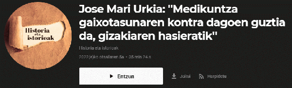 Jose Maria Urkia [Interneteko baliabidea - Audioa] : "medikuntza gaixotasunaren kontra dagoen guztia da, gizakiaren hasieratik" / ekoizpena, EITB