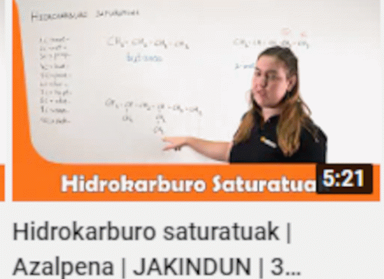 Jakindun euskaraz eta doakoa den hezkuntza plataforma da; ikasleen eskura euskarazko bideoak jartzen ditu, azalpen errazekin, hobeto ulertzeko zailak egiten zaizkien (zaizkigun) ikasgaiak. Bideo honetan hidrokarburo saturatuak ikusiko ditugu.Hidrokarburoak, konposatu organikoak dira eta hidrogeno eta karbono atomoak soilik dituzte. Gai honi buruz gehiago jakiteko, ikusi bideoa!