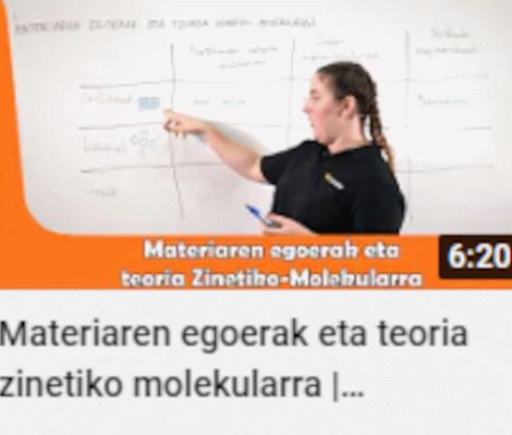 FilmSerie(ak): Jakindun (Youtube kanala)Publication details: Basauri : Jakindun.com, 2021Deskribapen fisikoa: Baliabide elektronikoa (7 min) : soinuduna, kolGaia(k): Generoa/Forma:Sareko errekurtsoak:Adina / Maila: Jakindun euskaraz eta doakoa den hezkuntza plataforma da; ikasleen eskura euskarazko bideoak jartzen ditu, azalpen errazekin, hobeto ulertzeko zailak egiten zaizkien (zaizkigun) ikasgaiak. Bideo honetan, materiaren egoerak eta teoria zinetiko molekularra ikusiko ditugu. Teoria zinetiko molekularrak materiaren egoerari buruzko informazioa ematen digu eta honek 3 puntu ditu, eta denok dakigun moduan, materialak 3 egoera desberdin izan ditzake. Beraz, bideo honetan teoria zinetiko molekularraren hiru puntuak materia egoeraren arabera nola aldatzen diren ikusiko dugu.