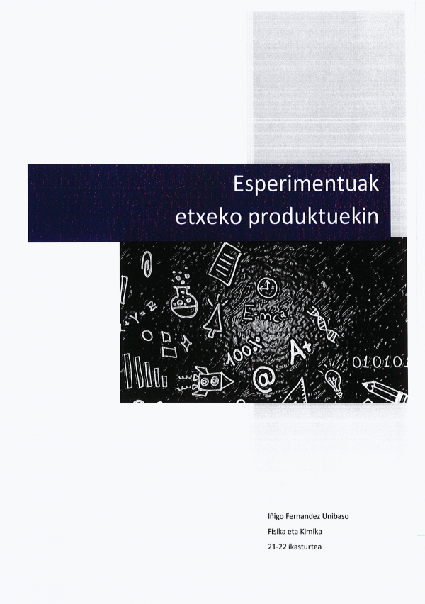 Lan honek DBHn erabiltzeko aproposak izan daitezkeen fisika edota kimikako zenbait esperimentu biltzen ditu. Nahiz eta esperimentuak DBHko 4. mailako ikasleei zuzenduta egon, esan dezakegu beste maila batzuetan erabilgarriak izan daitezkeela (egia ere bada, mailaren arabera, zenbait moldaketa egin beharko direla, agian). Betiere metodo zientifikoa abiapuntu izanik, etxean edo bizitza arruntean maneiatzen ohi diren produktuak eta materialak erabiltzen dira, orokorrean, esperimentuetan.