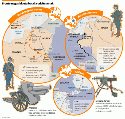 BERRIA Ikasgelak hezkuntza sisteman erabiltzeko askotariko edukiak eskaintzen ditu: irakurgaiak, bideoak, infografiak, audioak... BERRIA egunkariak landutako edukiak dira, azken urteotako argitalpen aukeratuetan oinarrituak. Gerra Handiak arrasto sakona utzi zuen Euskal Herrian: 6.000 hildako eta milaka zauriturekin ordaindu zen, odolez. Iparraldeko euskal herritarrak hegoaldekoengandik gehiago bereizi ziren, eta Frantziara sendo lotu.