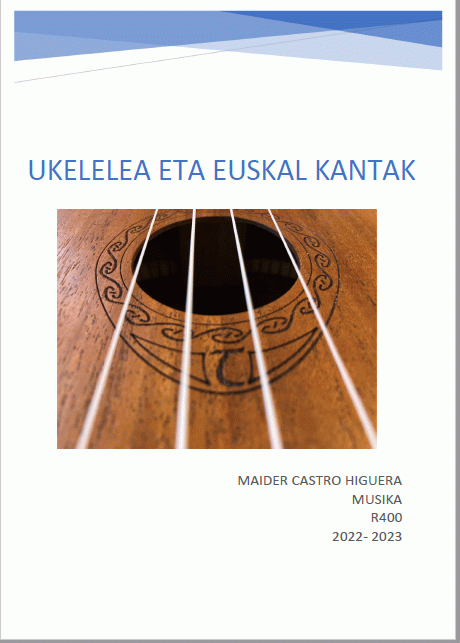 Lan honek ukelelea musika-geletan baliabide pedagogiko gisa erabiltzea proposatzen du, ikasleen motibazioa areagotzeko eta haien trebetasunak eta gaitasunak hobeto garatzeko. Askotariko praktikak egiteko aukera eskaintzen du, eta musika-gela aberasteko bidea. Bi atal nagusi bereizten dira. Lehenengo atalean, ukelelea erabiltzeko gida bat dago, eta musika-tresnarekin lotutako hainbat alderdi daude: historia, ukelele-motak, afinazioa, tablaturak, akordeen diagramak... Bigarren atalean, euskal kantak daude (hitzak, akordeak, audioak eta karaokeak).