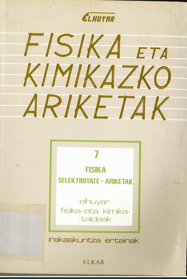TestuaSerie(ak): Fisika eta kimikazko ariketak. Selektibitate-ariketak (Elhuyar) ; ; 7 | Fisika eta kimikazko ariketak. Selektibitate-ariketak (Elhuyar) ; ; 7Publication details: Donostia : Elkar ; Elhuyar, 1991Edizioa: 2. argit., eguneratua eta emendatuaDeskribapen fisikoa: 186 or. : z.-b. ir. ; 24 cmISBN: - 84-7529-526-6