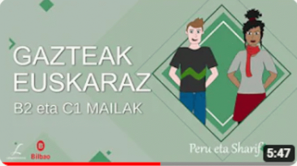 Gazteak euskaraz [Interneteko baliabidea - Bideoa] : adiskide onekin kontuak labur / gidoia, Ziortza Artabe ... [et al.] ; ahotsak, Aitziber Argiarro ... [et al.] ; Bilbo hiriaren ilustrazioak, Enrique Morente ; pertsonaien diseinua, Idoia Tolosa ; animazioa eta edizioa, Irati Zarandona