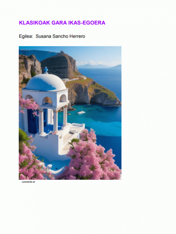 TestuaSerie(ak): IRALE (2023-2024) | R400 | R400 | IRALE (2023-2024 ikasturtea)Publication details: Bilbo : Irale, 2024Deskribapen fisikoa: 82 or. ; PDFGaia(k): Generoa/Forma:Sareko errekurtsoak:Adina / Maila: Ikas-egoera hau Greziako eta Erromako literaturari buruzko ikas-materiala da. Lanaren muina izan da hainbat jarduera praktiko sortzea, Literatura Unibertsala ikasgaiaren alde teorikoa osatzeko asmoz. Horrela bada, Literatura klasikoko zenbait testuren irakurketa abiapuntua izanik, askotariko jarduerak ditu lanak, ikasleek ahalik eta adimen-mota gehien landu ditzaten.