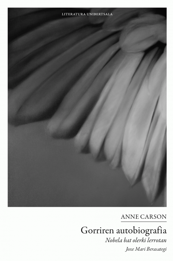 "Gorriren autobiografia : nobela bat olerki lerrotan" Herakles edo Herkulesen mitologian oinarrituta dago; zehatzago esanda, Estesikoro (K.a. 630-550) poeta grekoaren zati batzuetan. Heraklesen 10. lanaren gainekoak dira, zeinean Gerion munstro hegalduna bizi den uhartera joan, Gerion eta txakurra hil eta haren abere taldeaz jabetzen baita. Mitoa XX. mendera eta Amerikara ekarri eta bertsio moderno bat aurkezten digu Gerionen ikuspegitik. Gerionen barne-gatazka hegalek irudikatzen dute. Hegoak ezkutatu nahi dituen bakoitzean deseroso sentitzen da, eta uko egiten jarraitzen du, bere burua onartzeko egin duen borroka amaigabearen metafora gisa. Hegoak askatasuna dira, baina Gerion oraindik ez dago erabiltzeko prest. Etengabe saiatzen da hegoak ezkutatzen. Libre uzten dituen une bakarra da bakarrik dagoenean, hoteleko gelan adibidez, autoerretratu bat atera du. Zuri-beltzeko argazkian fetu posturan dagoen gizon gazte biluzi bat ageri da. Hegalen brodalan itzela ohean zabal-zabal.