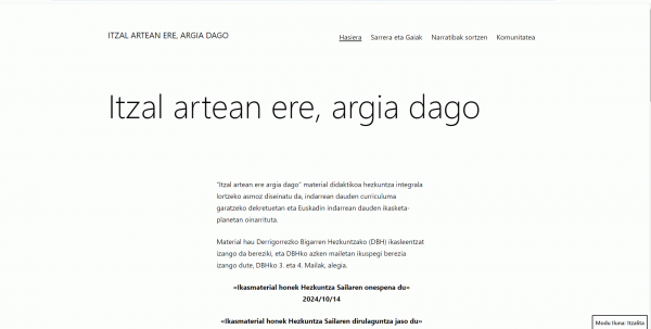 Itzal artean ere argia dago [Interneteko baliabidea - Webgunea] / [zuzendaritza, diseinu praktikoa, edukiak sortzea, aplikazioaren analisia eta programazioa, Fran Bodego Franco ; diseinu praktikoa, edukiak sortzea, interfazearen eta nabigazioaren diseinua eta maketazioa, multimedia ekoizpena, Fabian Hidalgo Perez ; aplikazioaren analisia eta programazioa, ilustrazio grafikoa, irudi eta multimedia ekoizpena, Jon Zamorano Navarro ; euskara berrikuspena, UZEI]