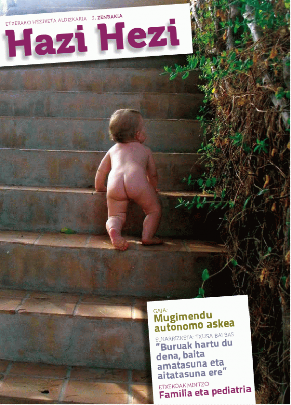 -Editoriala: Eman diezaiogun daukanari garrantzia -Labur-labur: -Kontsulta: -Gai nagusia: Mugimendu autonomo askea -Astez aste, urtez urte: Haurdunaldia : ukitu, ezagutu, gozatu -Astez aste, urtez urte: Lehen urteak. Amaiera zoriontsua -Astez aste, urte gozoak. Neba-arrebak : etsaiak ala lagunak? -Astez aste, urtez urte: Nerabezaroa. Nerabezaroa ulertu, nerabea ulertzeko -Elkarrizketa: Txusa Balbas (ginekologoa eta mediku homeopata) -Etxekoak mintzo: Gurasoak mintzo : "denera ezin da iritsi!" -Etxekoak mintzo: Familia eta pediatria taldea. Gramoek eta emozioek pisu bera duten kontsulta -Eztabaidagai: Negarra. Umeagatik ala helduagatik isilarazten da negarra? -Jolasak: Xabier Zabala (musikaria) -Sormenaz: Juan Kruz Igerabideri (idazle, poeta eta irakaslea) elkarrizketa : "Munduarekiko harreman emozionalaren irakurketa eskaintzen dio ipuinak haurrari"