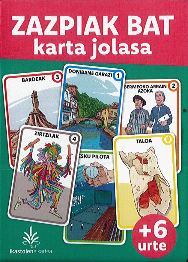"Zazpiak bat" karta jolasarekin Euskal Herria ezagutzeko aukera paregabea duzue, eta, bide batez, baita euskararekiko eta euskal kulturarekiko atxikimendua indartzeko ere. Euskal Herriko 7 herrialdeetan barrena murgiltzeko 6 gai-mota ezberdin proposatzen dira: hiriburuak, artea eta musika, natura, inauteriak, gastronomia eta kirola.