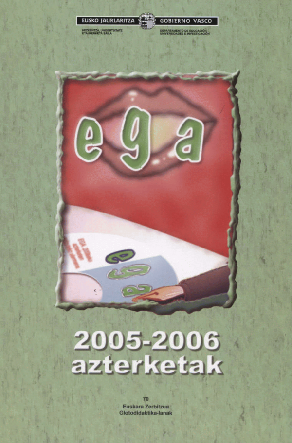 TestuaSerie(ak): Euskara Zerbitzua. Glotodidaktika-lanak (Hezkuntza Saila) ; ; 70 | EGA azterketak (Hezkuntza Saila) ; ; 12Publication details: Vitoria-Gasteiz : Eusko Jaurlaritzaren Argitalpen Zerbitzu Nagusia, 2006Edizioa: 1. argitDeskribapen fisikoa: 261 or. : z.-b. ir., argk. ; 30 cm + 2 disko konpaktu (CD-DA)ISBN: - 978-84-457-2518-4