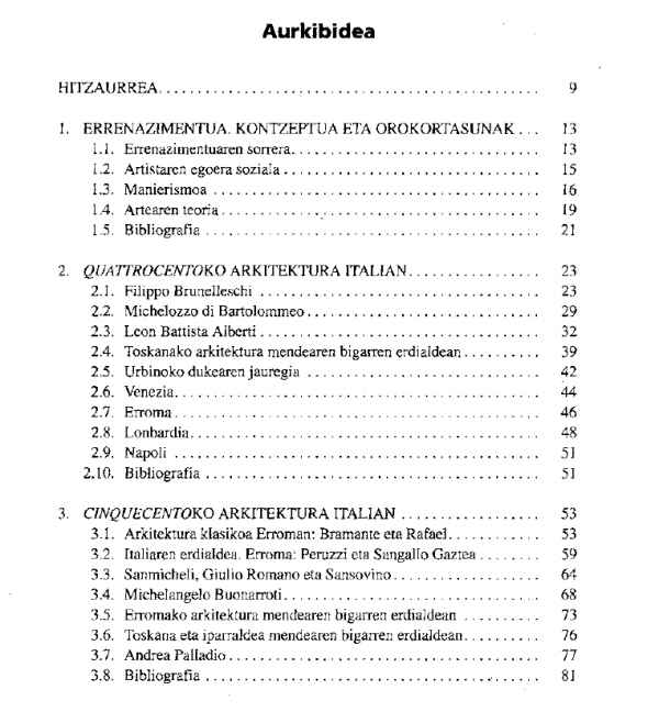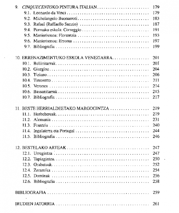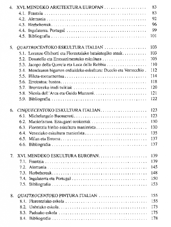 Gaia(k): Generoa/Forma:Sareko errekurtsoak:Adina / Maila: Liburu hau euskaraz argitaratzen den Errenazimentuari buruzko lehendabiziko eskuliburua da. Aztergai ditu XV. mendean Europako arteak, batez ere Italian eta Herbehereetan, izan zituen aldaketak eta XVI. mendean Errenazimentua izeneko estilo berriak nola zabaldu ziren Europako gainerako herrialdeetara. Artearen eta artistaren kontzeptu modernoak Italian lortu ziren XV. mendean eta, horregatik, lehendabiziko kapituluak Italiako arteari eskaini zaizkio. Arkitektoek, eskultoreek eta pintoreek Antzinatea berreskuratzeko gogoa eta Erdi Aroko kristautasunarekin bat egiteko asmoa bultzatu zituzten. XVI. mendean asmo horien jarraipena, gailurra eta krisia gertatu ziren, guztiok ezagutzen ditugun maisu handien lanetan: Leonardo, Rafael eta Michelangelo. Ondoren, Manierismoaren krisiak agerian utzi zuen Errenazimentuaren ideala ezinezko ahalegina izan zela. Hala ere, XVI. mendean Errenazimentua Frantziara, Alemaniara, Ingalaterrara eta beste herrialde batzuetara zabaldu zen.