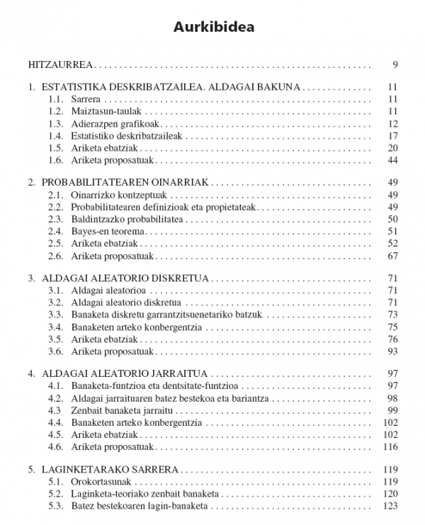 Estatistikaren Oinarriak. Ariketak izeneko liburu hau Estatistikaren hastapenak aztertu, ikasi edo landu behar dituzten pertsonentzat baliagarria izateko egin da. Bertan azaltzen diren gaiak ere argi eta ulergarri batean garatu dira. Helburu praktikoetarako erabilgarria izan dadin, liburuko gai bakoitzaren hasieran jakin beharreko kontzeptueta emaitza teorikoak azaldu dira, eta ondoren, gaiari buruzko ariketa ebatziak eta ariketa proposatuak daude. Ariketetako aplikazioak bereziki Ingeniaritza Teknikoa ikasten duten ikasleei zuzenduta daude eta Estatistikaren oinarriak ikasteko prozesuan lagungarri ziango zaizkielakoan gaude.