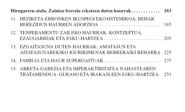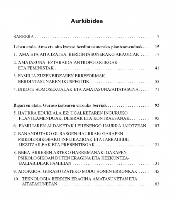 Azken urte hauetan familia kontzeptua aldatu da, batik bat familia-eredu desberdinak nagusitu direlako, eta egungo euskal familien erdia baino gutxiago sar dezakegu familia "tradizionalaren" ereduaren barruan. Batetik, sexu bereko pertsonen arteko ezkontza Estatu Espainiarrean legala denetik guraso izateko aukerak agertu dira, eta horrekin batera, eztabaida zabaldu da profesionalen artean eta gizartean. Bestetik, adopzioa egun ama eta aita izateko ohiko bidea bihurtzen ari da; gehienetan nazioarteko bidea jorratzen da eta Euskal Herri koloretsua da horren ondorioa. Familia-eredu berri hauetan gero eta ohikoagoa da guraso bakarra izatea edota dibortzio-prozesutik pasatu diren gurasoak ikustea. Halaber, hain haur gutxi izaten den herri honetan haurrak izateko planteamenduaren inguruko hausnarketa ere beharrezkoa dela pentsatzen dugu, hala nola bikotean haurra ekartzeak izango duen inpaktuaz. Era berean, gizartean gurasoen korrespontsabilitatea suspertzen duten lan-neurriak eta neurri legalak ere agertu berri dira. Alderdi hauek guztiak jorratzeko nola haur batzuekiko (hiperaktiboak, tenperamentu zailekoak, ezgaitasun bat daukatenak, supergaituak, eta behar berezidun haurren adopzioak) esku-hartze estrategiak planteatzeko, zenbait diziplinatako profesionalen lana bildu da liburu honetan.