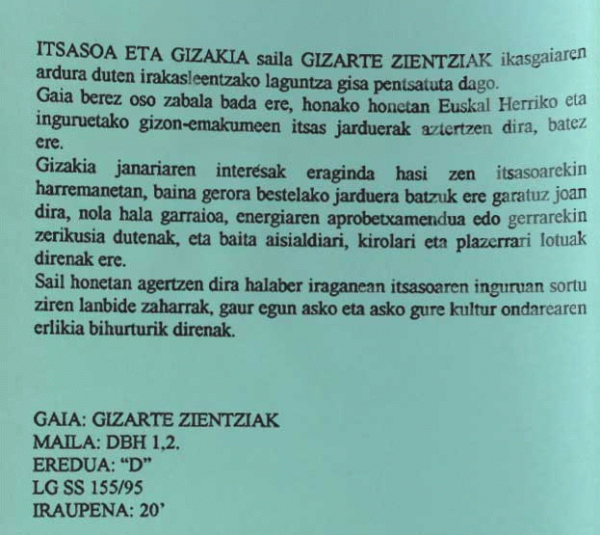 FilmSerie(ak): Itsasoa eta gizakiaPublication details: Donostia : Alcedo PC , L.G. 1995Deskribapen fisikoa: 1 bideo (VHS) ( 20 min.) : soinua, kol ; . + 1 gida didaktikoaGaia(k): Generoa/Forma:Sareko errekurtsoak:Adina / Maila: ITSAOA ETA GIZAKIA saila GIZARTE ZIENTZIAK ikasgaiaren ardura duten irakasleentzako laguntza gisa pentsatuta dago. Gaia berez oso zabala bada ere, honako honetan Euskal Herriko eta inguruetako gizon-emakumeen itsas jarduerak aztertzen dira, batez ere. Gizakia janariaren interesak eraginda hasi zen itsasoarekin harremanetan, baina gerora bestelako jarduera batzuk ere garatuz joan dira, nola hala garraioa, energiaren aprobetxamendua edo gerrarekin zerikusia dutenak, eta baita aisialdiari, kirolari eta plalzerrari lotuak direnak ere. Sail honetan agertzen dira halaber iraganean itsasoaren inguruan sortu ziren lanbide zaharrak, gaur egun asko eta asko gure kultur ondarearen erlikia bihurturik direnak.